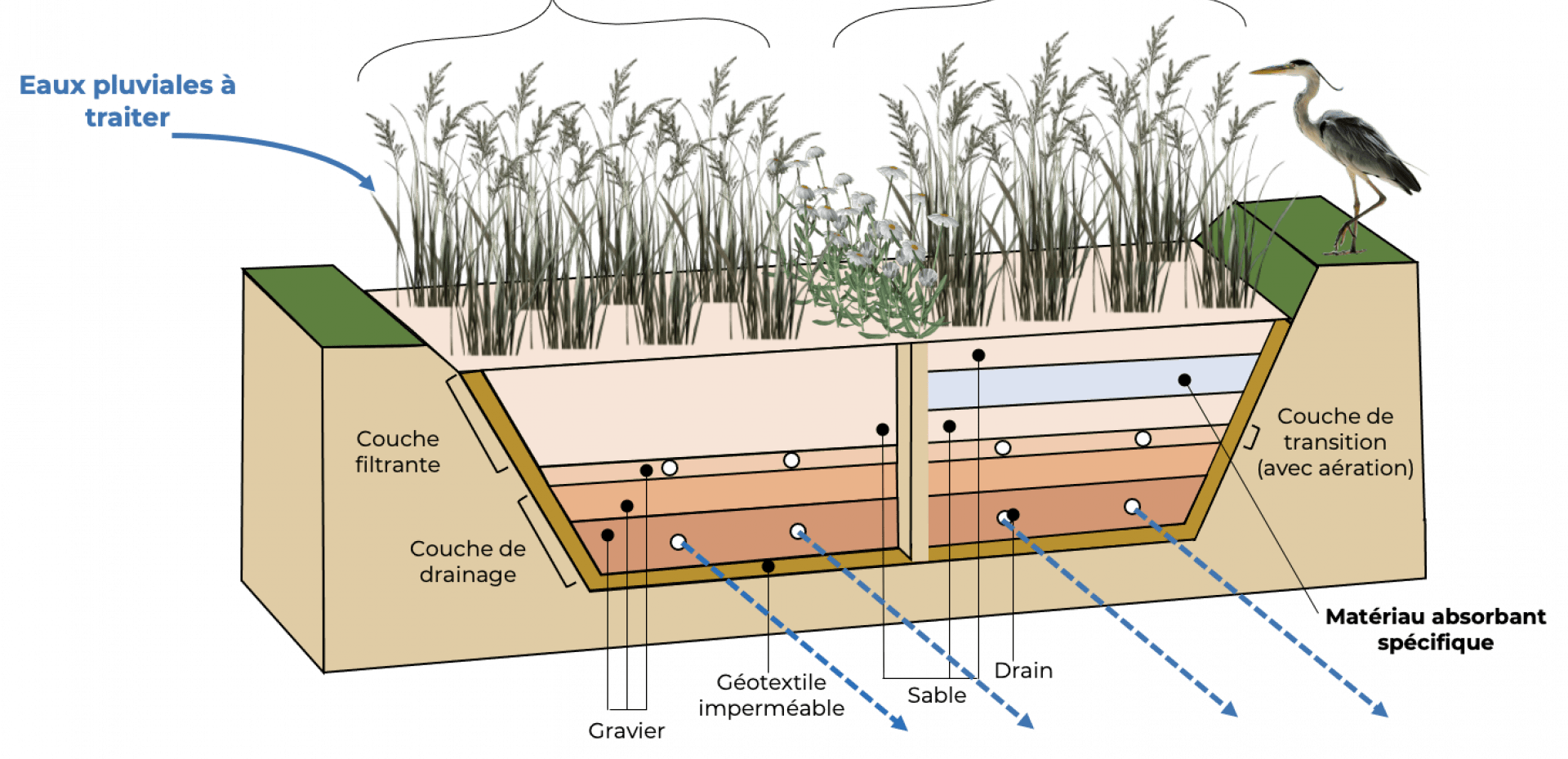 Operating principle The vertical flow reed bed filter The planted filter consists of two filters. One serves as a reference. The second is used to test a specific adsorbent material for organic and inorganic micropollutants. Localiser